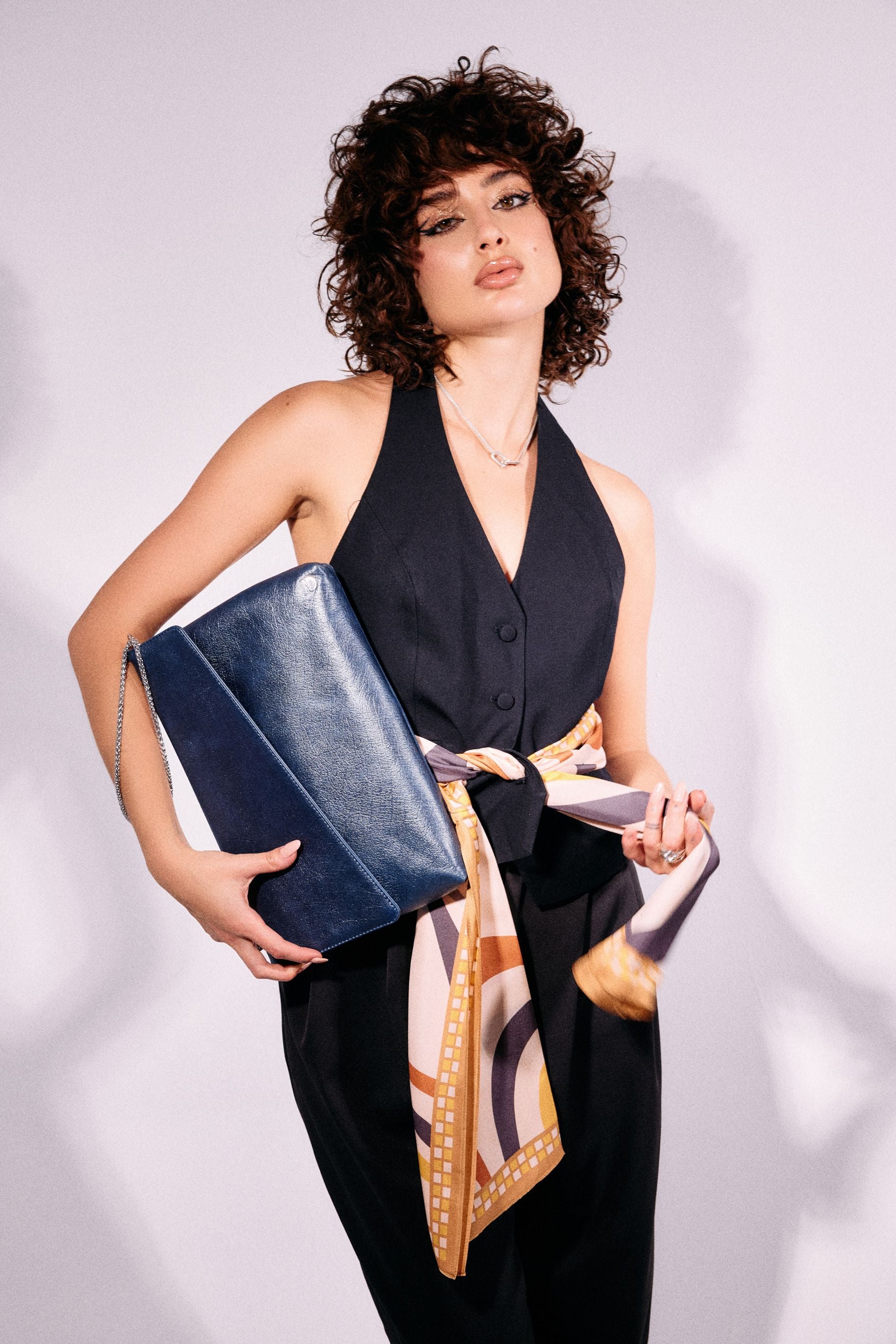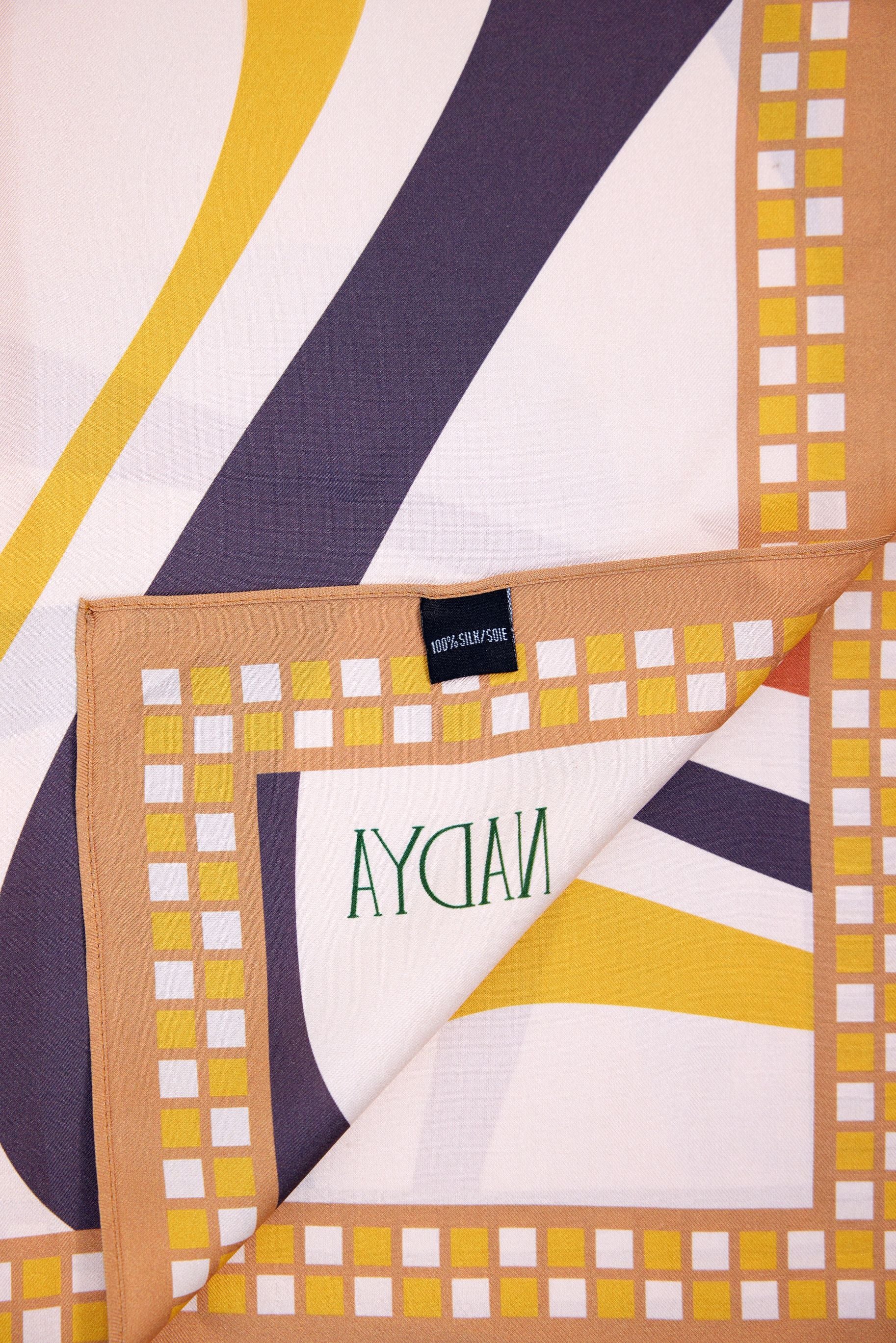This multiway scarf is inspired by the 1970s fashion and disco culture, designed for all your day and night occasions. The checkered frames are our take on the reflective light disco ball featured on the ceilings of many discothèques, and the swirl pattern is created to give you movement and style.