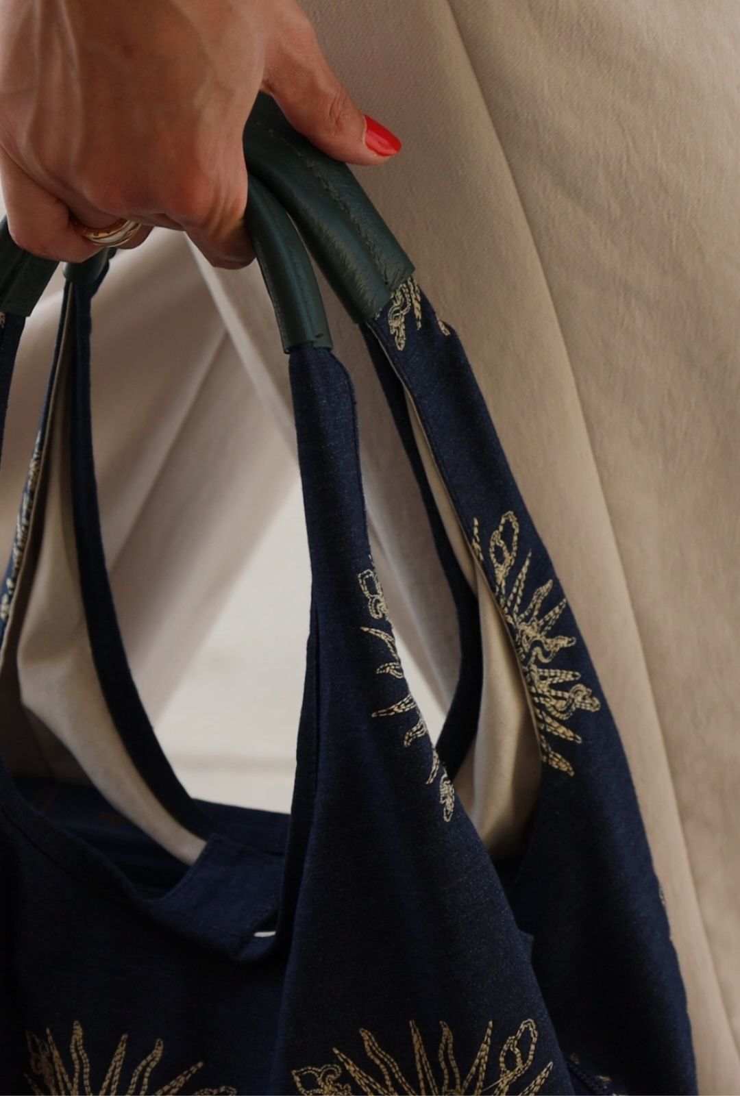 Each bag is finished with a unique handle: some in green or brown recycled leather, others in full denim. All equally stunning — all part of the same story.