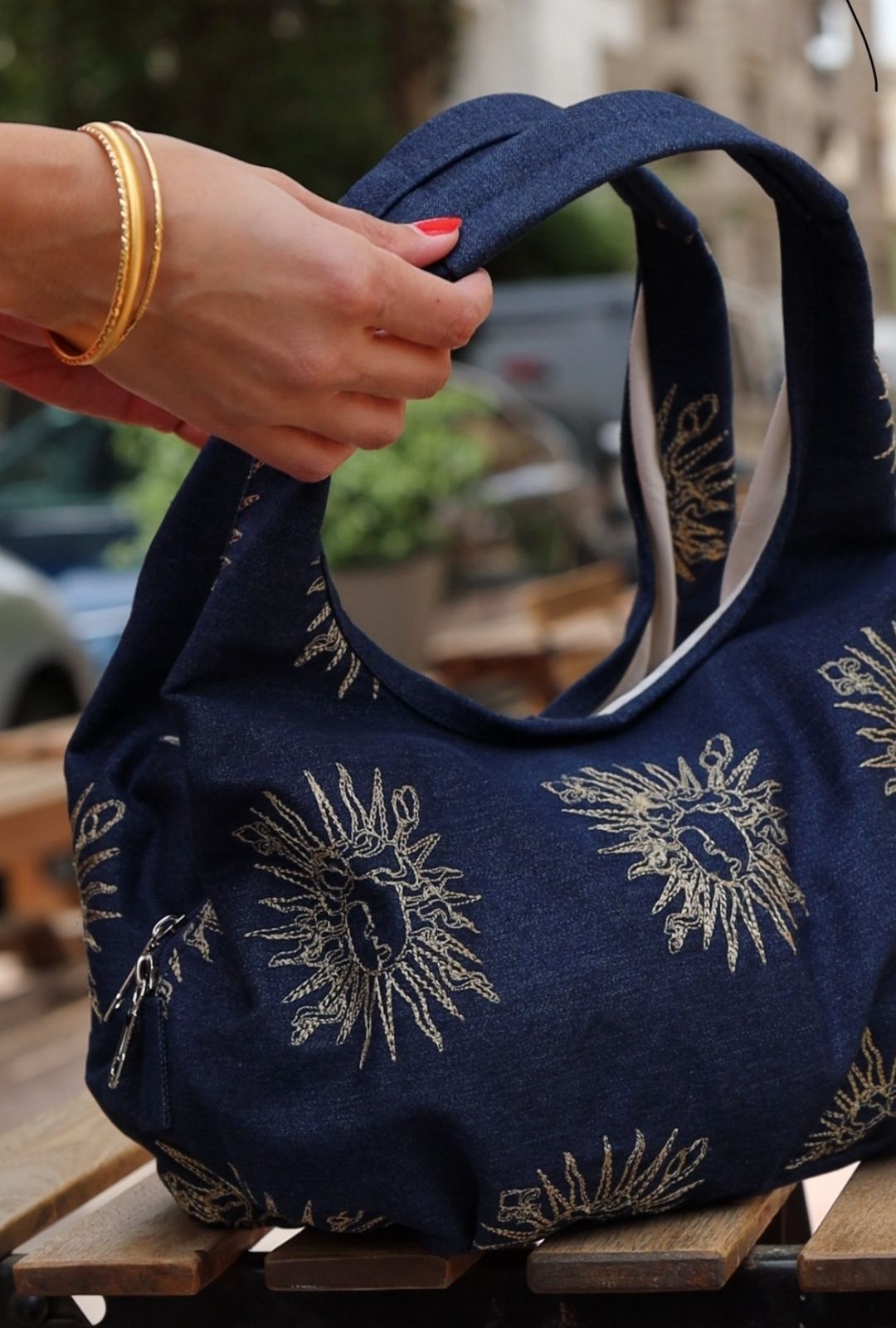 Our signature Soleil bag, now reimagined in premium denim — a bold take on a beloved classic. This edition features a soft yet structured silhouette, brought to life with our signature gold-embroidered sun at the center, making each piece feel like a wearable work of art.